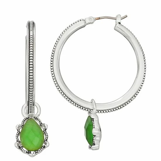 With their pretty green simulated crystals and antiqued finish, these silver tone drop hoop earrings from Napier are sure to be one of your favorites.
